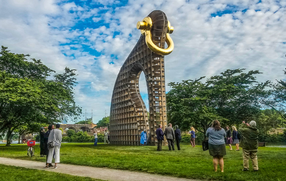 Pennoni was instrumental in the successful installation of Big Bling along the Schuylkill River Trail, just north of Boathouse Row, in Philadelphia. The eye-catching wood structure was multi-tiered and wrapped in chain-link fence, adorned with a colossal gold-leafed shackle near the top. Layers of laminated timbers and plywood combined to create an animal-like and abstract figure with an amoeboid opening in the center. With limited time to design, permit, construct a foundation, and install the sculpture, Pennoni’s Design-Build Group along with our Philadelphia Structural division expedited the design/documentation of the foundation system to accelerate the start of construction.